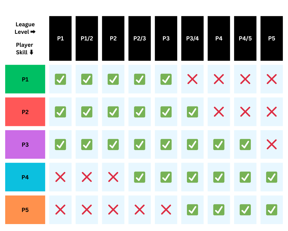 Each league is designated by a specific skill level (e.g., P1, P2, P3, P4, P5), and we encourage players to register for leagues that align closely with their current skill level. This ensures a fair and enjoyable experience for all participants, regardless of their ability.